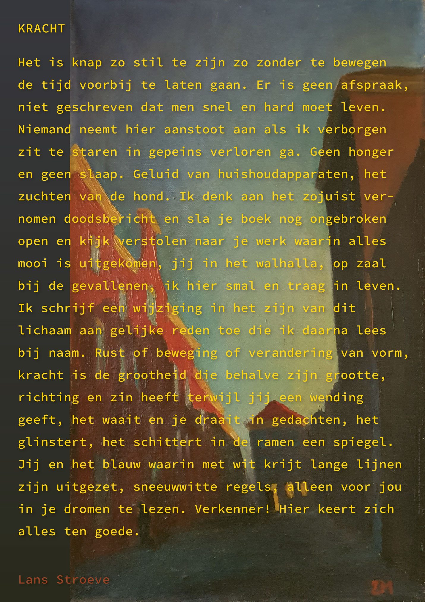 This poster holds a poem of Lans Stroeve; ‘Strength’. In the background I have used a painting of her grandfather. (The Hoogstraat in Schiedam).